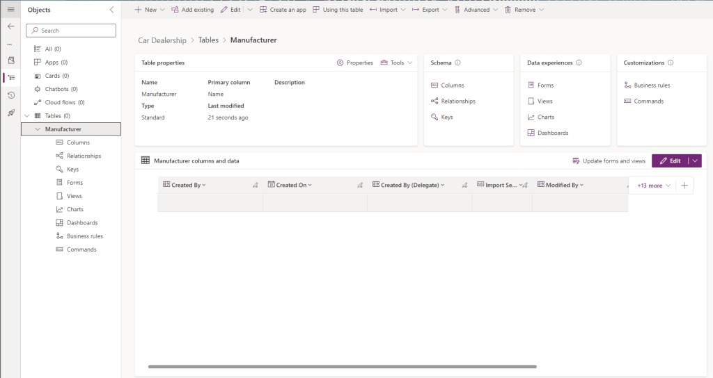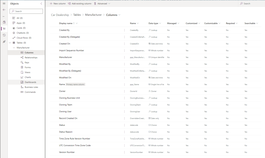 Note that Dataverse creates a lot of columns for us by default! Of interest are the following:
