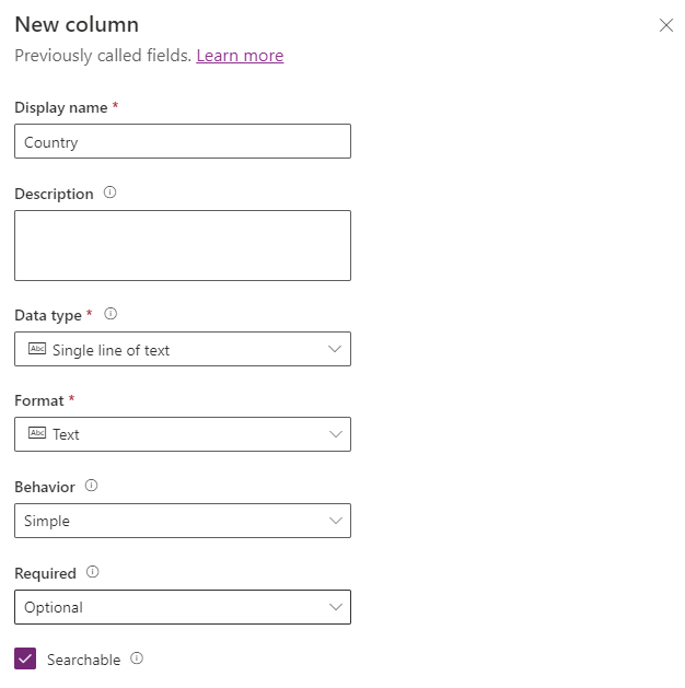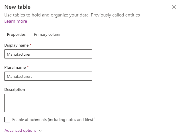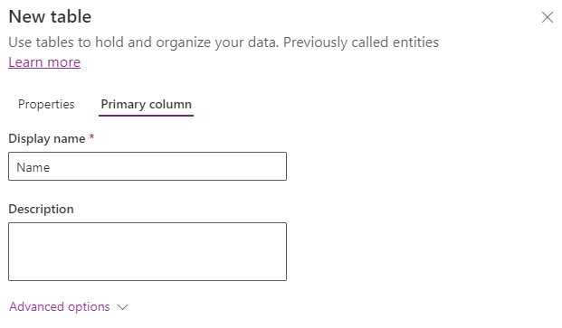 By default, this value is Name. Note that the Primary column is not the same a traditional database Primary Key value – that is a separate field created by Dataverse in the background that we don’t need to worry about now. Think of Primary column as the main descriptor field when referring to any row in this table i.e. instead of saying “The record with ID=1” we might say “The Audi record“; we refer to the row by some meaningful value. Click on Advanced options to see the following: