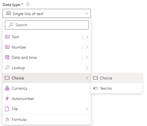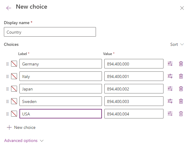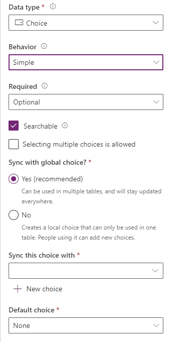- Choices – using the + New choice button, I’ve added in all the options shown. We can set the Label, and Dataverse will assign a Value for each entry (you don’t have to use the numbers I have entered). Note that we can reorder our list by clicking the start of the row and dragging it to the desired position.