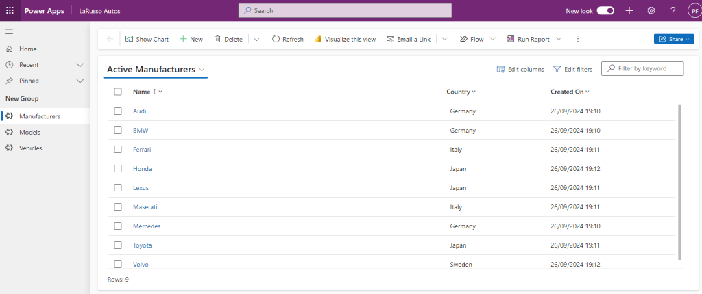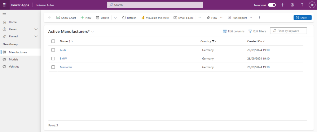 Now we come to the real magic of model-driven apps. Let’s say I’m only interested in seeing the Manufacturers from Germany. If this was a web page that I was coding from scratch (or even a Canvas app for that matter), I would have to create bespoke functionality to pass the key-value pair of Country-Germany to a back end service, which in turn would have to search the underlying dataset for applicable records, then order them by the chosen order by column (either ascending or descending), and show only those records for the selected page (even typing this up has tired me out). With model-driven apps, we have such filtering available out of the box.