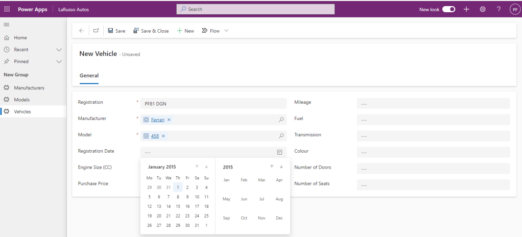 Our Primary Column here is the Vehicle Registration. I’ve selected the Manufacturer as Ferrari – note that when I select the Model field, only Ferrari Models are displayed – this is because we have configured the Manufacturer and Model fields to be related in the previous post.