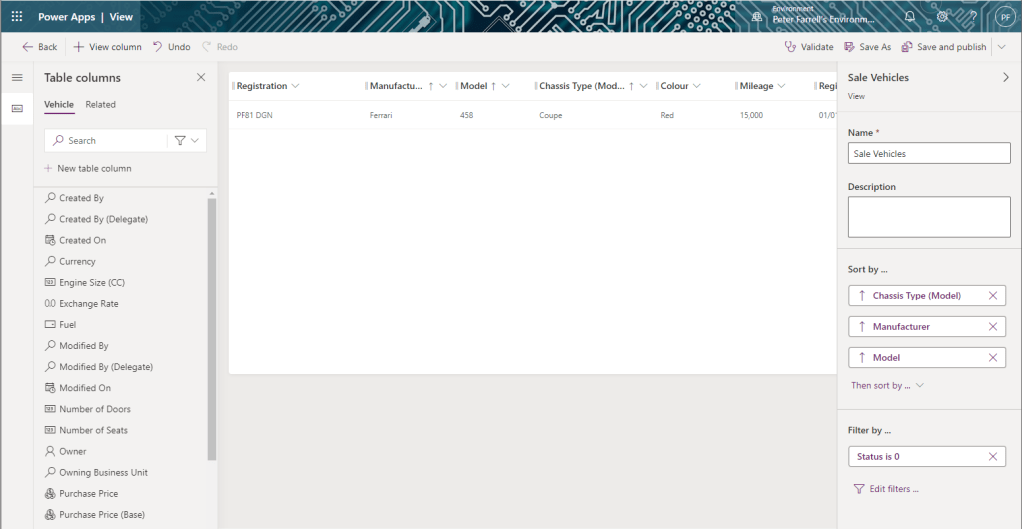 Click Save As in the top ribbon to launch the Save As dialog. Click Save to create our new Sold Vehicles view. Then click Save and publish.