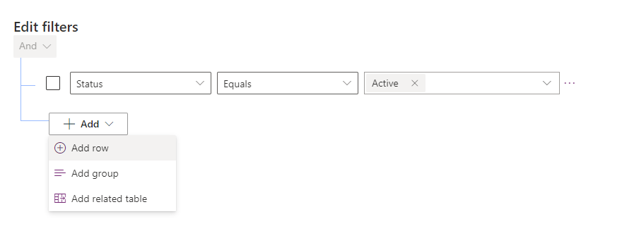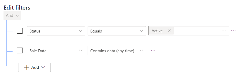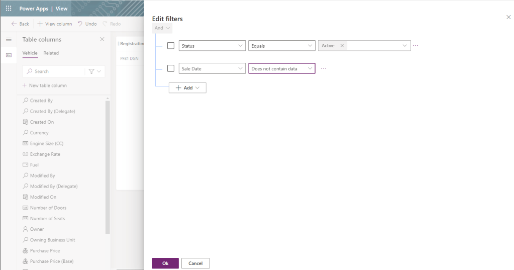 The only filter applied if that the Vehicle Status is Active. Click on + Add > + Add row. From there add the filter Sale Date Does not contain data – these are the unsold vehicles we are interested in. Click Ok.