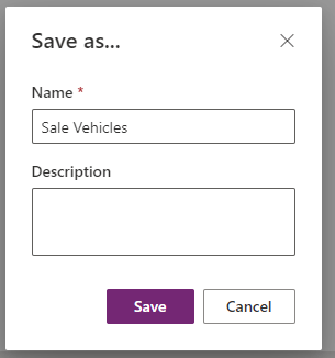 Click Save As in the top ribbon to launch the Save As dialog. Click Save to create our new Sale Vehicles view.