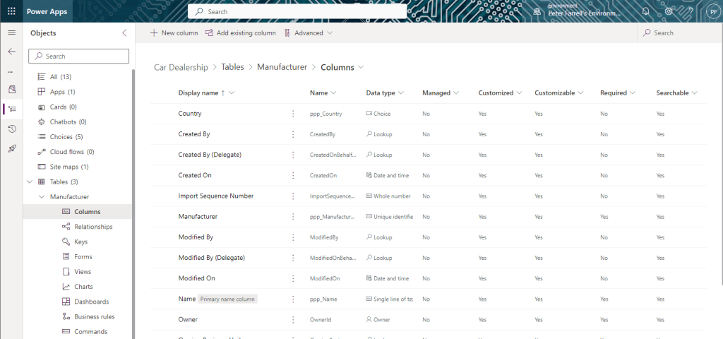 To obtain this information, we will define Rollup columns to aggregate this values up to the Manufacturer table. From our solution view, click Tables > Manufacturer > Columns in the side navigation, and then + New column in the top ribbon.