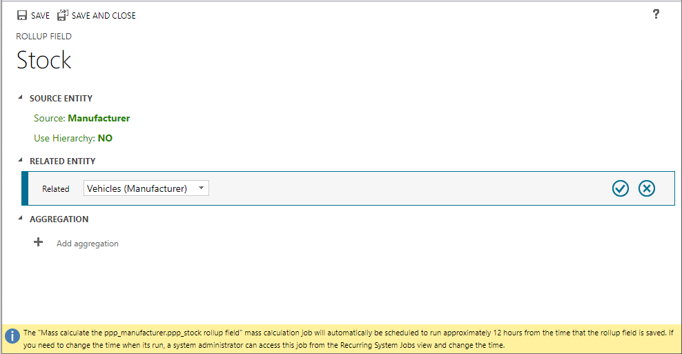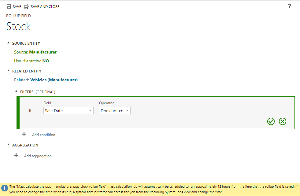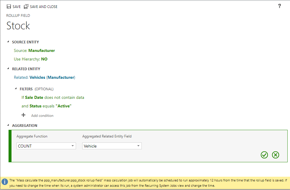 Our aggregation here is COUNT Vehicle. Click on the green tick and then Save and Close.