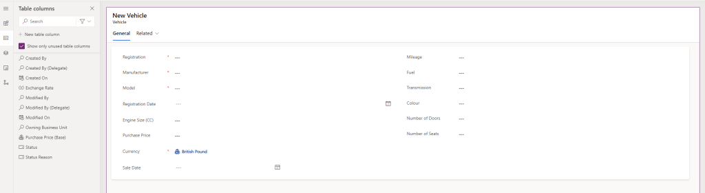 we also add the Currency column to the Vehicle Main form. Note that the default value is the environment currency (in my case, British Pound). Click Save and publish.