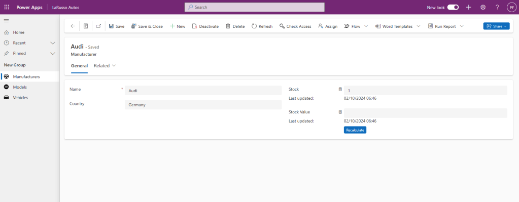 So now we have set the Currency at both the Manufacturer and Vehicle level. If we give our Rollup time, all figures will be calculated. Another option is to manually trigger the Rollup from the Manufacturer form by clicking the Recalculate buttons for each Rollup field.