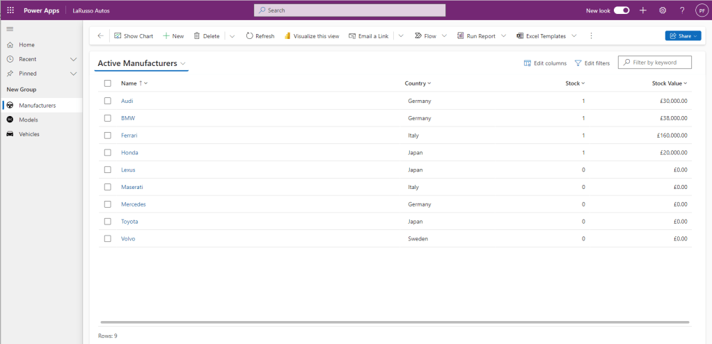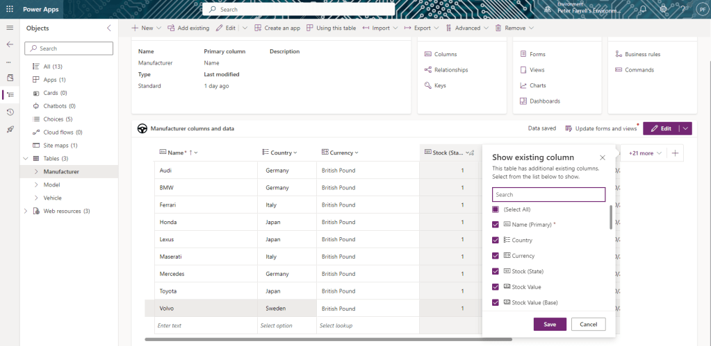 From the solution view, select Tables > Manufacturer in the side navigation. Click on the Edit button to display the chosen columns below. This screen will allow us to edit records on the fly, so we set the Currency value for each row to match (in my case, British Pound).