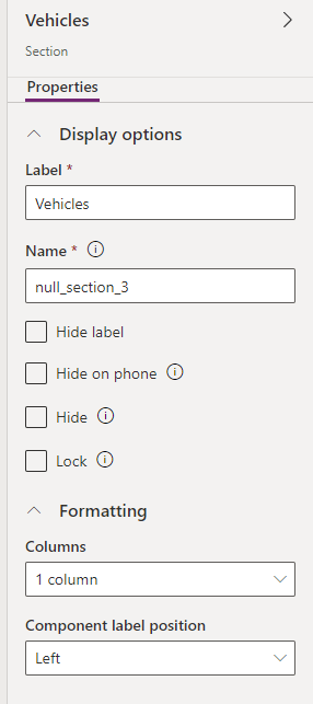If we select our new section, the properties dialog will open on the right of the screen. I’ve opted to change the Label from the default New Section to Vehicles.