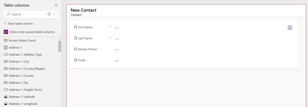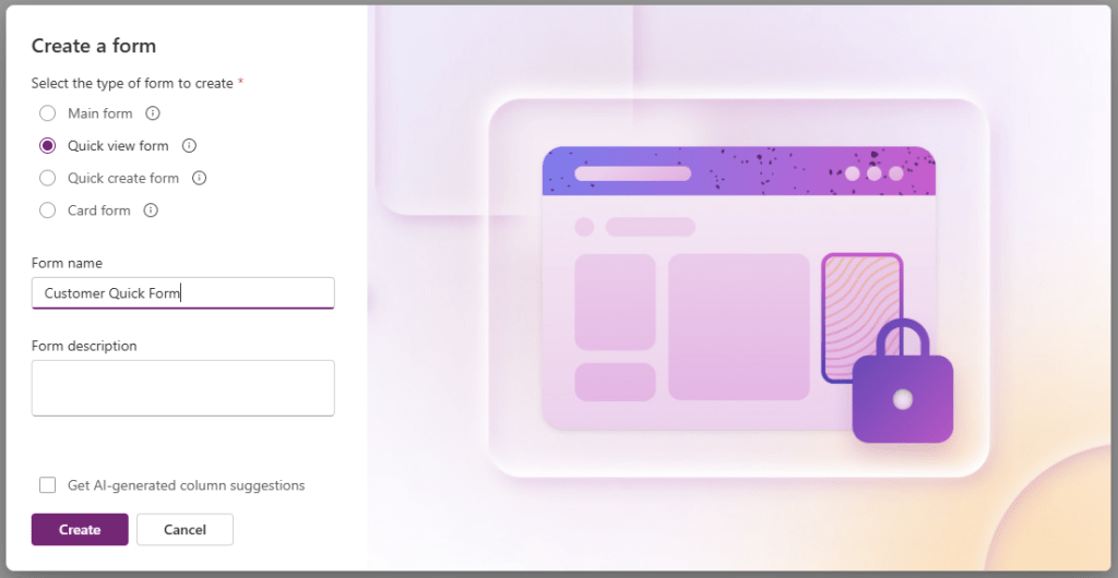 Lets begin with the Contact table. From our solution view, select Tables -> Contact -> Forms from the side navigation. From the top ribbon, click the + New Form button and fill in the dialog shown below, being sure to select the Quick view form radio button.
