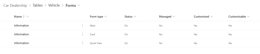 If we navigate to Tables -> Vehicle -> Forms from the side navigation, we can see that we already have a Quick View form named Information – this is because all custom tables will have these forms by default.