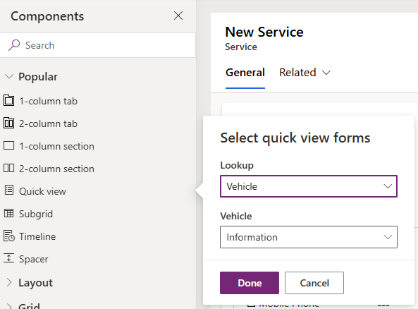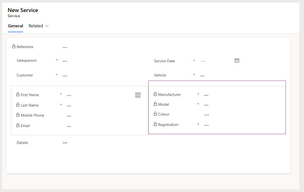 Despite being forms, Quick View Forms are read only, and are limited to single column displays. They are used to present a short summary of a selected record – in our case, we would like to add a short summary of our Customer and Vehicle entities.