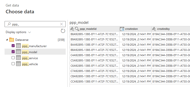 Now we want to compare this data with the contents of the Manufacturer table. As per the previous post, click Home > Get data > More… from the top ribbon. Select Dataverse as our data source, sign in and select the Manufacturer and Model tables before clicking the Transform data button.