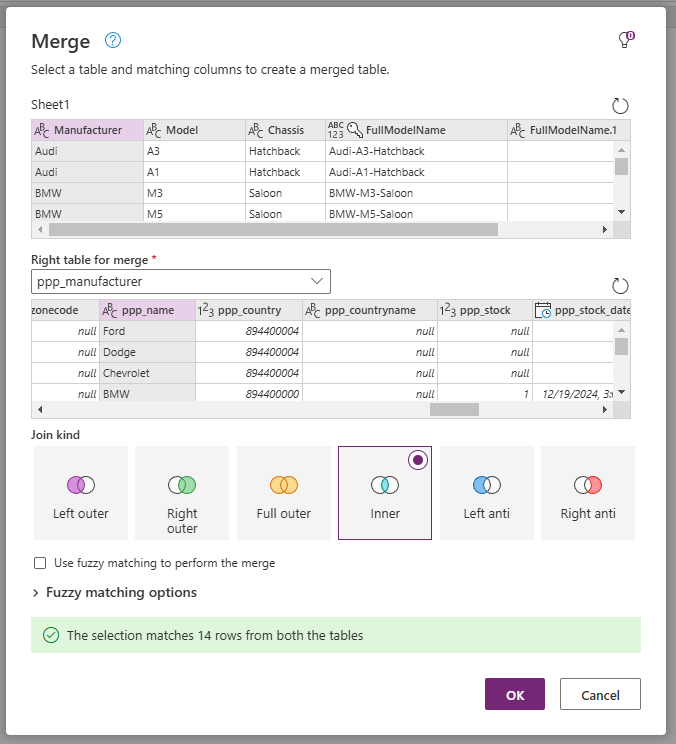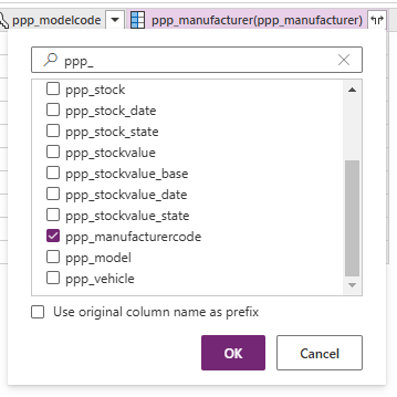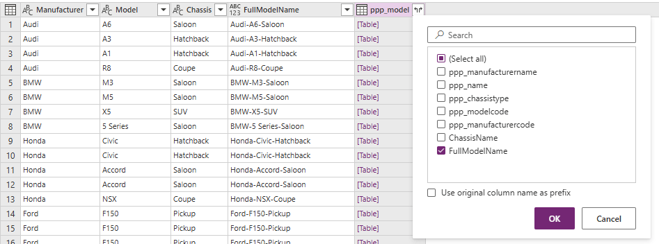 Click OK. This will update our first dataset by matching all known Models with the records in Dataverse, and the others with no match. Click on the ppp_model column and select the FullModelName column before clicking OK.