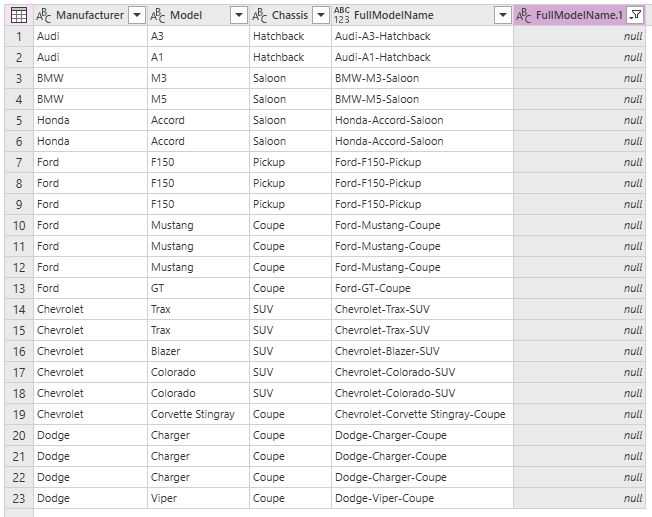 As per the previous post, we only want to add new records to our Model table i.e. the ones with no match. Click on the Filter rows button in the top ribbon and select Keep rows where “FullModelName.1” equals null before clicking OK.