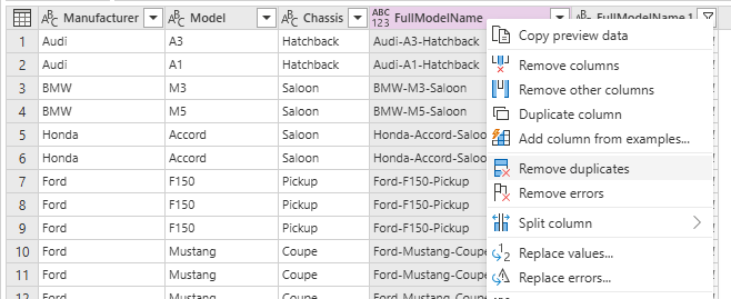 However, we do have a number of duplicate models here which we should remove. To solve this, right click on the FullModelName column header and select Remove duplicates from the dialog that appears.