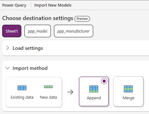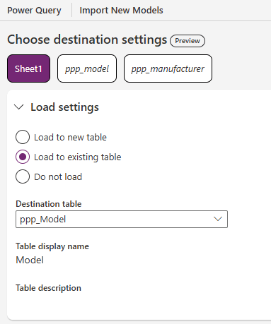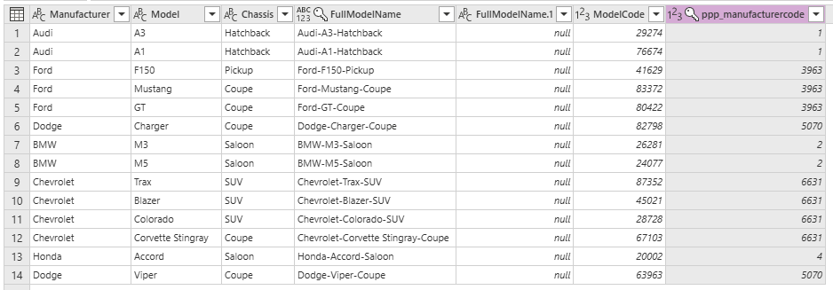 Now we have all our new records to add to the Model table. Pay particular attention to the ppp_manufacturercode column before clicking Next at the bottom right of the Power Query dialog.