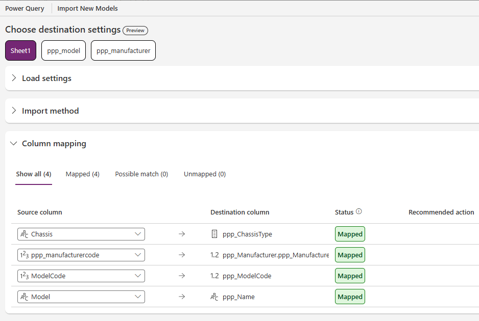 The second mapping here is even more interesting. This is how we successfully map the Manufacturer-Model foreign key relationship when using Dataflows. The Destination column here is ppp_Manufacturer.ppp_ManufacturerCode, denoting a relationship on the ppp_Manufacturer table, specifically the ppp_ManufacturerCode column. Let’s see what happens on import…