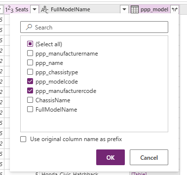 As we have already updated our Manufacturer and Model tables with all new records in our previous posts, the rows of our CSV dataset will find a match in Dataverse. If we expand the Model column in the merged dataset, select the following columns: