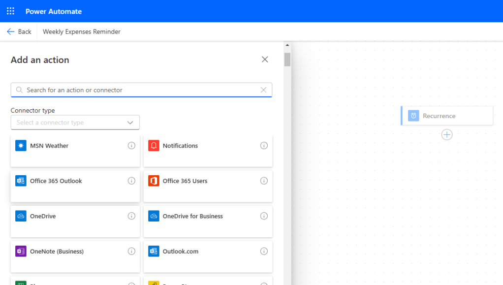 The left hand dialog will fill with hundreds of options here. Each option is a Connector – this represents a product or service that can be integrated into Power Automate flows using out of the box features i.e. no coding expertise required. This includes products and services outside of the Microsoft ecosystem and there are over 1000 connectors available. If you haven’t done so already, I’d encourage you to have a look at what’s available and let your imagination run wild!