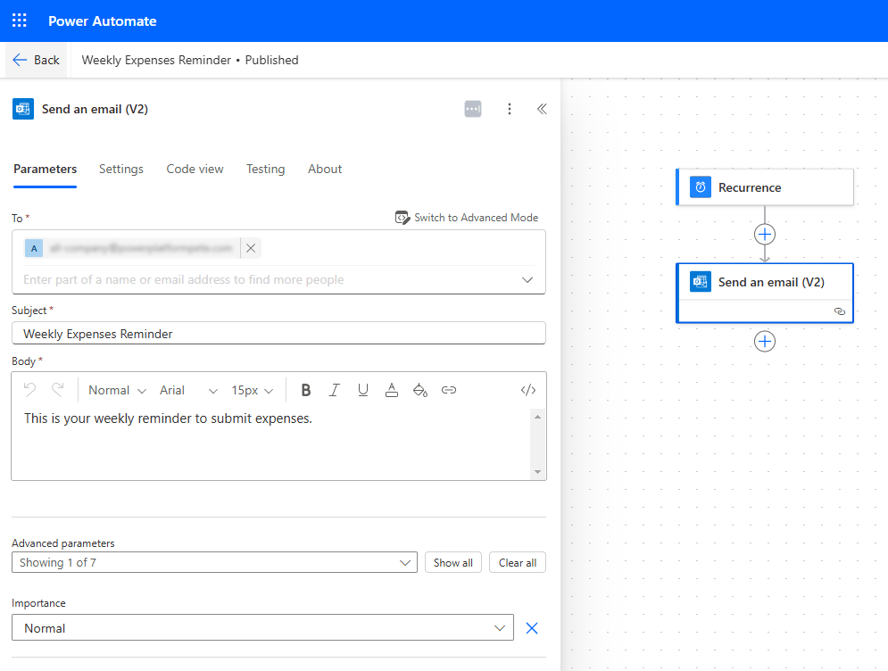 Once signed in, I can click on the Send an email (V2) Action to set the parameters, which I complete as follows: