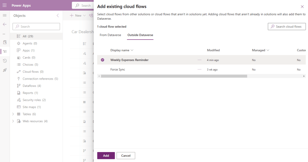 From the dialog that appears, select Outside Dataverse, and select our Weekly Expenses Reminder flow before clicking Add.