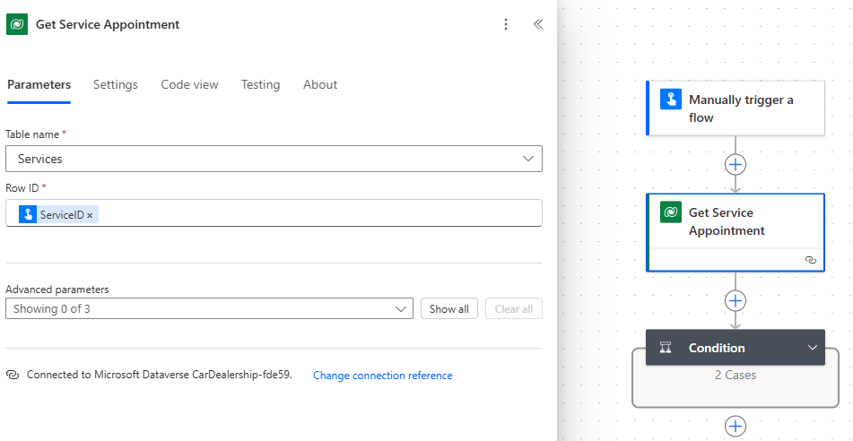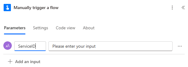 - Row ID – Select ServiceID from the Manually trigger a flow Trigger (previous step, our text input).