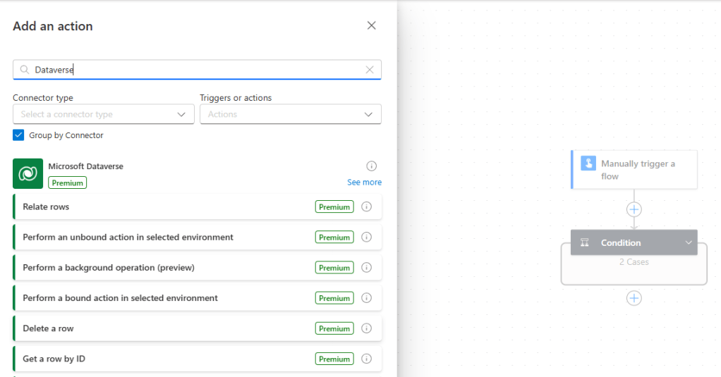 The previous Dataverse Trigger gave us access to the Service record that triggered the flow. Because we removed that Trigger, we need at fetch the Service record from Dataverse now – add in a Dataverse connector below our new Trigger, and select the Get a row by ID Action.
