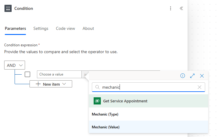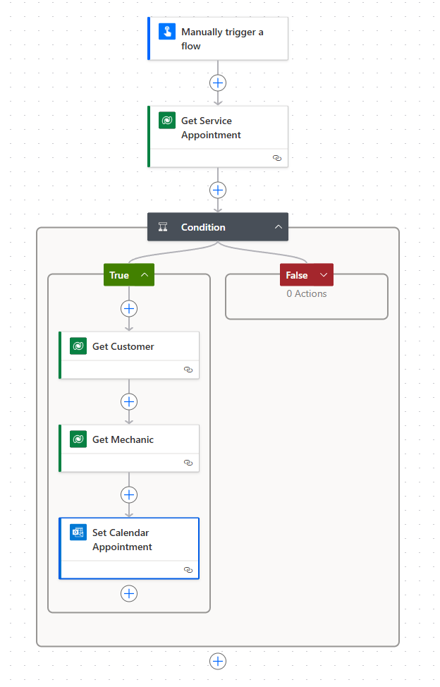 We need to update all these Actions to reference the output from our new Get Service Appointment Action. We begin by updating the Condition to reference the Mechanic (Value) from our Get Service Appointment Action.