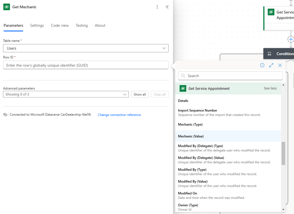 Then the Get Mechanic Action to reference the Mechanic (Value) from our Get Service Appointment Action.