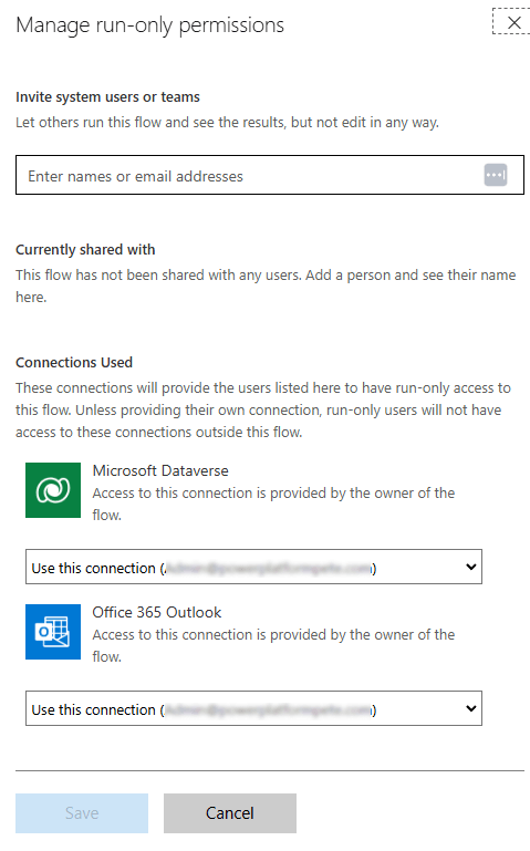 For this flow, we have to set the Dataverse and Outlook connections to run as a specific user, rather than the User who triggered the flow.