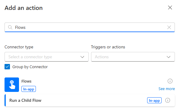 In its place, we add the Run a Child Flow Action from the Flows connector.