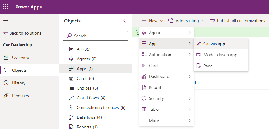 Data model complete, so now we move onto the app! From our solution view, click + New > App > Canvas app from the top ribbon.
