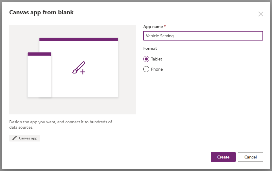 Set the App name to Vehicle Servicing, and format as Tablet then click Create.