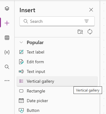 From the leftmost menu, click the + link. This will allow us to add elements to the canvas. Click on Vertical Gallery.
