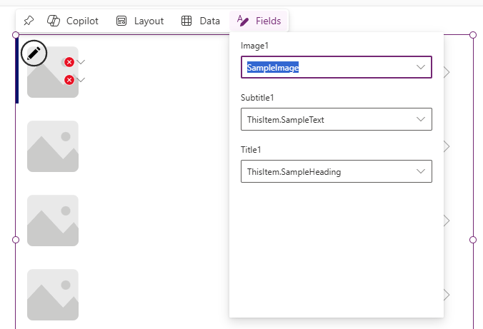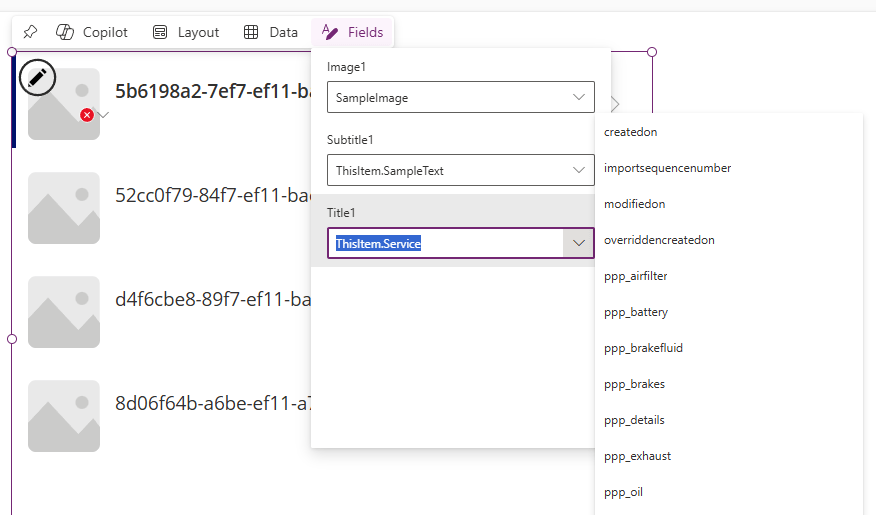Initially, we will see some errors – click on the Fields button to see the properties being displayed. Each row in our list represents a record in the Services table, and the object ThisItem is how we reference the record. We have errors here because the Service table does not have columns called SampleText and SampleHeading, so we should change those.