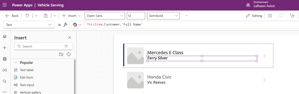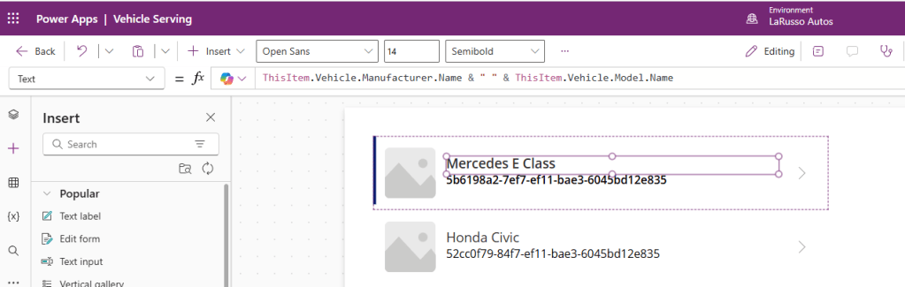 We want to display the Vehicle Manufacturer and Model, so we update the formula bar to be ThisItem.Vehicle.Manufacturer.Name & ” ” & ThisItem.Vehicle.Model.Name. Note how we are concatenating two values here into a single string. Observe the updated items.