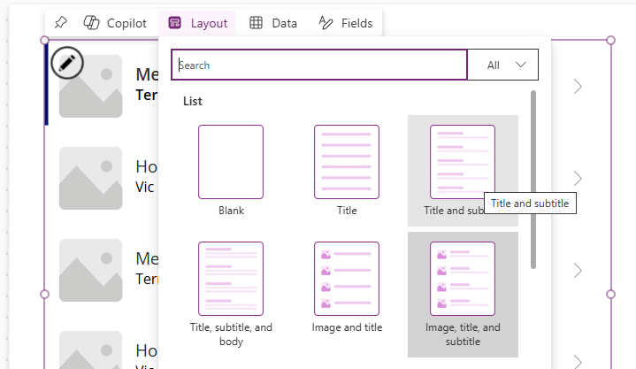 Lastly, we want to get rid of that useless image on the left. Click on the Gallery control and select the Layout button. Choose Title and subtitle from the options.