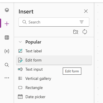 The next element to add to our canvas app is a Form – this should display the details of the item selected in the Gallery. From the left side control bar, click the + icon and click on Edit form.