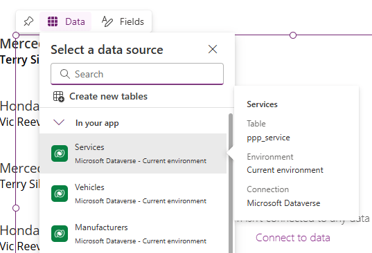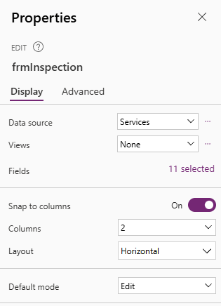 Much nicer. Next we update the following advanced property – we set Item to galServices.Selected. This will populate all of the Form fields with the values from the selected record in our Gallery.
