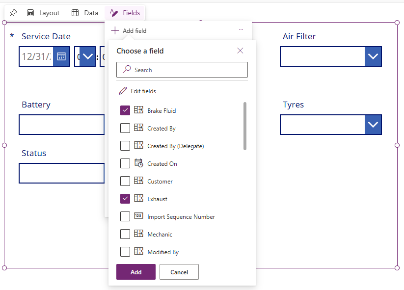 click on the Fields button, then + Add field to add in all our new vehicle inspection columns we created at the start of this post.