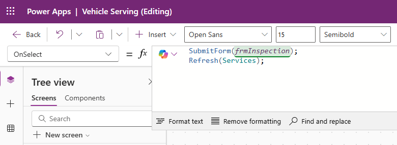 Next, we have to define what happens when we click the Save button. Select our button, and set the OnSelect property in the formula bar to be as follows: