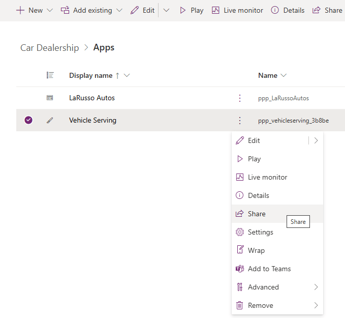 Final steps – we want to share this app with the LaRusso Autos mechanics. Select our new canvas app from the solutions view. Click the three dots and then the Share option.
