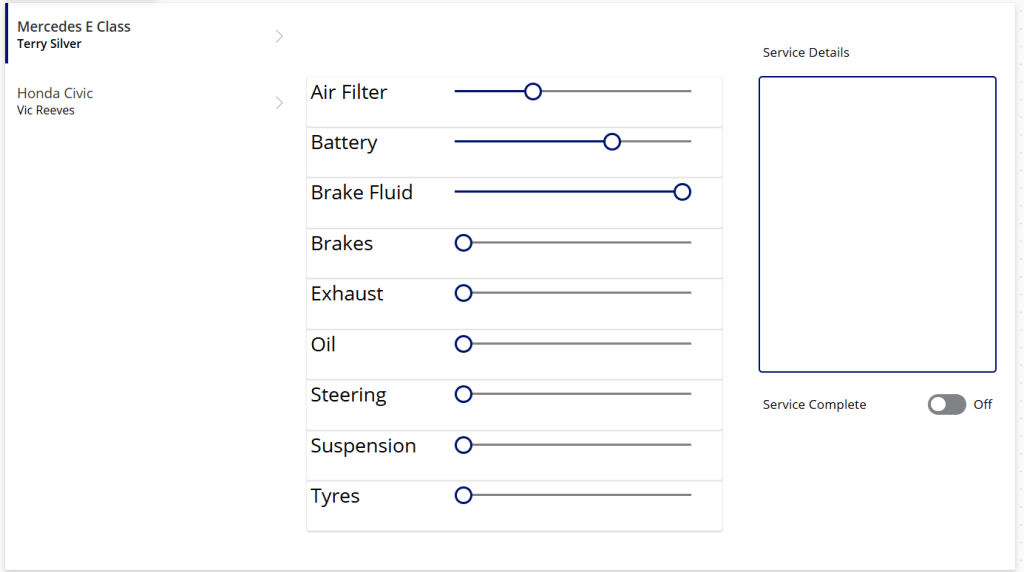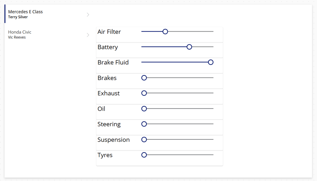 - Sliders – e.g. sldAirFilter, sldBrakes, sldOil
