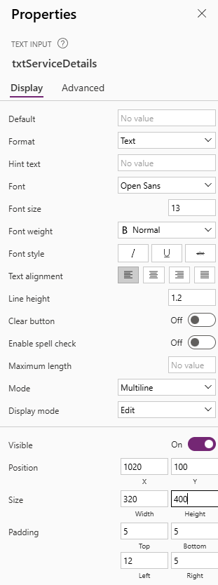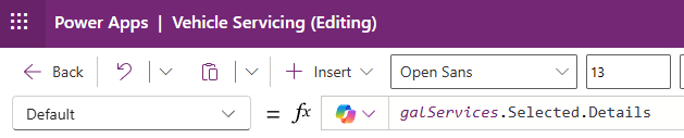 Rename the Text input control as txtServiceDetails and set its Default value to be galServices.Selected.Details – the Details property of the currently selected Gallery item.