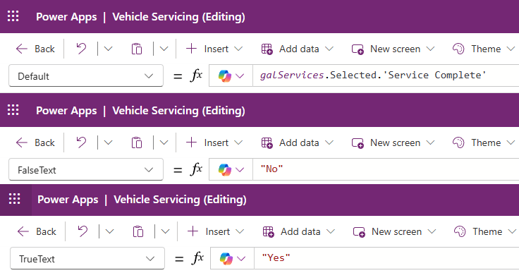 Rename the Toggle control as tglServiceComplete as set the following properties: