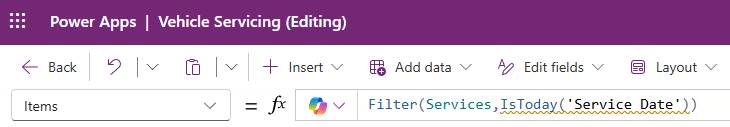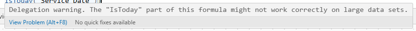 The problem here is that we are performing the IsToday function on every row of the Services table – that is, the complete dataset is loaded into our app. This will cause performance issues as the size of the dataset increases. This is a common mistake developers make, and not just in Power Platform – an application performs well on release date, only for performance to degrade with time because the application has not been designed to handle a growing dataset.