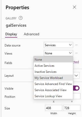 Save and publish our View. Return to our canvas app and select our Gallery control. From the Properties menu on the right of the screen, set the Views property to our newly published View.
