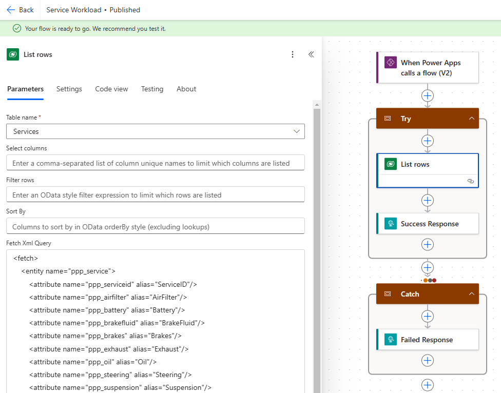 Within the List rows action, we are going to set the Table name property to Services and the Fetch Xml Query property to the XML found here. We are using Fetch XML again to perform a query to fetch the data we need across multiple tables: